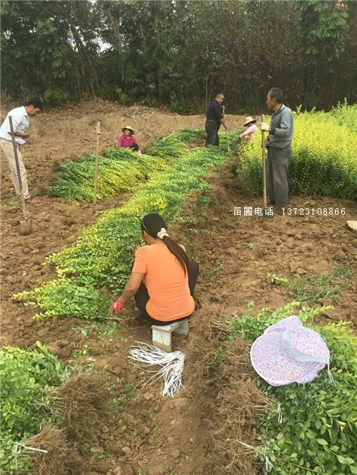 二年生金叶女贞苗_高50-60公分金叶女贞出售,金叶女贞价格行情,金叶女贞工程苗高40-60公分,金叶女贞/河南金叶女贞/金叶女贞价格我公司多年荣获农业产业化龙头企业,可随时在线提供现场金叶女贞基地实拍照片,及实时较新较全面的金叶女贞价格、河南金叶女贞价格,河南金叶女贞技术管理咨询,河南金叶女贞供求资讯等。如有需求可预订,客户可实地任意选购,现场看货起苗品质百分百放心,验收满意后装车付款,量大可送货上门,欢迎惠顾! 我公司金叶女贞基地,现有300万株高40-80公分的优质金叶女贞、河南金叶女贞,金叶女贞球,全以市场较低金叶女贞价格直销,欢迎来人来电咨询! 金叶女贞可以作为色叶绿篱,也可丛植,可塑性极高,能大程度地满足园林修建的需求,且可以多种叶片颜色搭配组合,为园林艺术增色。 华东,华南等地区。(3)生长习性:金叶女贞性喜光,而耐阴性较差,耐寒力中等,适应性较强,以疏松肥沃,通透性良好的沙壤土地块栽培为佳。形态特征:金叶女贞是美国加州的金边女贞与欧洲女贞树种杂交而成。落叶灌木,其嫩枝带有短毛。(4)叶革薄质,单叶对生,椭圆形或卵状椭圆形,先端尖,基部楔形,全缘。新叶金黄色,因此得名为金叶女贞,老叶黄绿色至绿色。(5)总状花序,花为,呈筒状白色小花,核果椭圆形。 为什么这么说呢?那是因为今天小园介绍的植物——金叶女贞,是卵叶女贞和Aureum的杂交出来的“宝宝”,那么它俩的下一代更像谁呢?从形态上来看,金叶女贞的叶,花和果都更像卵叶女贞,从另一亲本那里可能只继承了叶绿素合成障碍的吧……下面就和小园一起来看看它长什么样吧金叶女贞(1)拉丁名:Ligustrum?×?vicaryi?Rehder别称:英国女贞。今天小园给大家介绍一种严格意义上不能称之为“物种”的东西金边女贞科属:木犀科 女贞属(2)分布区域:原产于美国加州。中国于20世纪80年代引种栽培。分布于中国华北南部内含一粒种子金叶女贞树种不仅仅可以丛植后小园再给大家总结一下金叶女贞的基本特征:1.叶:对生,金黄色。2.花:白色,四瓣。3.果:椭圆形核果。 岩石园,墙体,立交桥等地方广泛裁种。其非常耐阴,叶色浓绿,到了秋天还会变红,是遮阴和护土的良好选择。在背阴的地方用量很大。金边黄杨金边黄杨是比较的观叶植物,其叶色泽鲜绿,斑叶特别美观。因为金边黄杨极耐修剪,所以常被用作庭院中的绿禽树种种植。金边黄杨可以经过整形,环植在门道边或者作为花坛中心种植。小叶女贞小叶女贞枝叶紧密,圆整,能够抵抗多种有毒气体,是优良的抗污染树种,在庭院中经常能看到它的身影。 多用在绿地广场,或组字或组拼图案,还能用于小庭院装饰,总之,用途广,性能不错,前景是不用说的。金叶榆金叶榆根系发达,耐贫咯,生长迅速,成景效果执,耐强度修剪,可塑性也很强。金叶榆既可以培有黄色乔术,做园林风景树,也可以培育成黄色灌木及高桩。金叶榆的应用也比较广泛,可以当做绿禽,色带,拼图和造型,除了大量运用于城市绿化之中,金叶榆还可大量用于山体景观生态绿化中,能够防止水土流失。 紫叶小檗对是不可缺席的树种。它适应性强,耐半阴,耐寒,不怕高温也耐修剪,综合性能比较强,而且应用范围比较广,可以用来布置花坛,花境,在园林中常与常绿树种作块面色彩布置。小龙柏小龙柏是一种名贵的庭院树,树冠呈圆筒形,树型宛若盘龙,观赏价值很高。小龙柏能够吸收多种有害气体,也具有一定的除尘效果。小龙柏的绿化效果在色块植物中还是比较强的,颜值也抗打,所以,发展前景大有可观。 在园林配置时,注意色彩搭配,管理时及时修剪就好。色彩美丽,受到人们的欢迎。三,金叶女贞金叶女贞是木犀科女贞属的一个杂交种,原产美国加州,我国在上世纪八十年代引进栽培,现在城市园林绿化中很流行。由于它的新发叶片金黄色,单叶对生,长圆形,故名“金叶女贞”。它的新枝生长比较快,枝叶密集,通常人们作矮绿篱栽植,耐修剪,也容易造型,在布置园林小品镶边时常用,现在园林绿化中广泛栽培,是人们喜欢的绿篱树种。 卵形,深绿色,茎干直立生长明显,因此现在通常作中,高绿篱。它的生长适应性强,喜欢肥沃,需要注意多施肥,一般作绿篱寿命十年左右需要更新。二,紫叶小檗紫叶小檗又叫红叶小檗,是小檗科常绿灌木。原来在我国华北,东北,秦岭山区,近些年经过人工培育,在园林绿化中普遍栽培。它的形态特点叶片紫红色,叶边有尖齿,茎干短,生长慢,四月前后开花,花朵黄色。果实成熟后鲜红色。通常作彩带构图植物或作矮绿篱应用。 绿篱是一种通常采用的栽植方式。主要起着镶边,分隔空间,屏障视线,防护等作用。用作绿篱的树种一般要求分枝多,叶片小,生长慢,耐修剪的常绿树种。一般要求抗性比较强,病虫害少,没有毒性和臭味等的树种才能作绿篱植物。下面结合我平时看到的几种绿篱或彩带植物介绍如下,与大家共同交流。一,大叶黄杨这里说的大叶黄杨是卫矛科植物,正式中名叫冬青卫矛。城市园林绿化中它的特点是作中绿篱(高度50-120公分)或高绿篱(120-160公分)非常实用。以前在绿篱树种少的时候也常作矮绿篱(50公分以下)。它的叶片少大或由于花坛镶边和花境栽植。它的生长适应性强它与小叶女贞非常接近满条金黄色海桐海桐是海桐科常绿灌木。 每亩播种量为7公斤左右。因为女贞出苗时间较长,约需1个月,播种后好在畦面盖草保墒